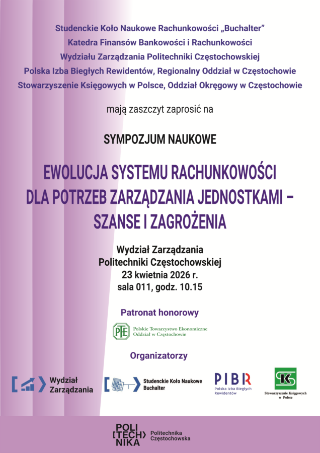 Oddział Okręgowy w Częstochowie Stowarzyszenie Księgowych w Polsce zaprasza do udziału w sympozjum naukowym pt. „Ewolucja systemu rachunkowości dla potrzeb zarządzania jednostkami – szanse i zagrożenia”, które odbędzie się 23 kwietnia 2026 r. o godz. 10:15 w sali 011 Wydziału Zarządzania Politechniki Częstochowskiej.